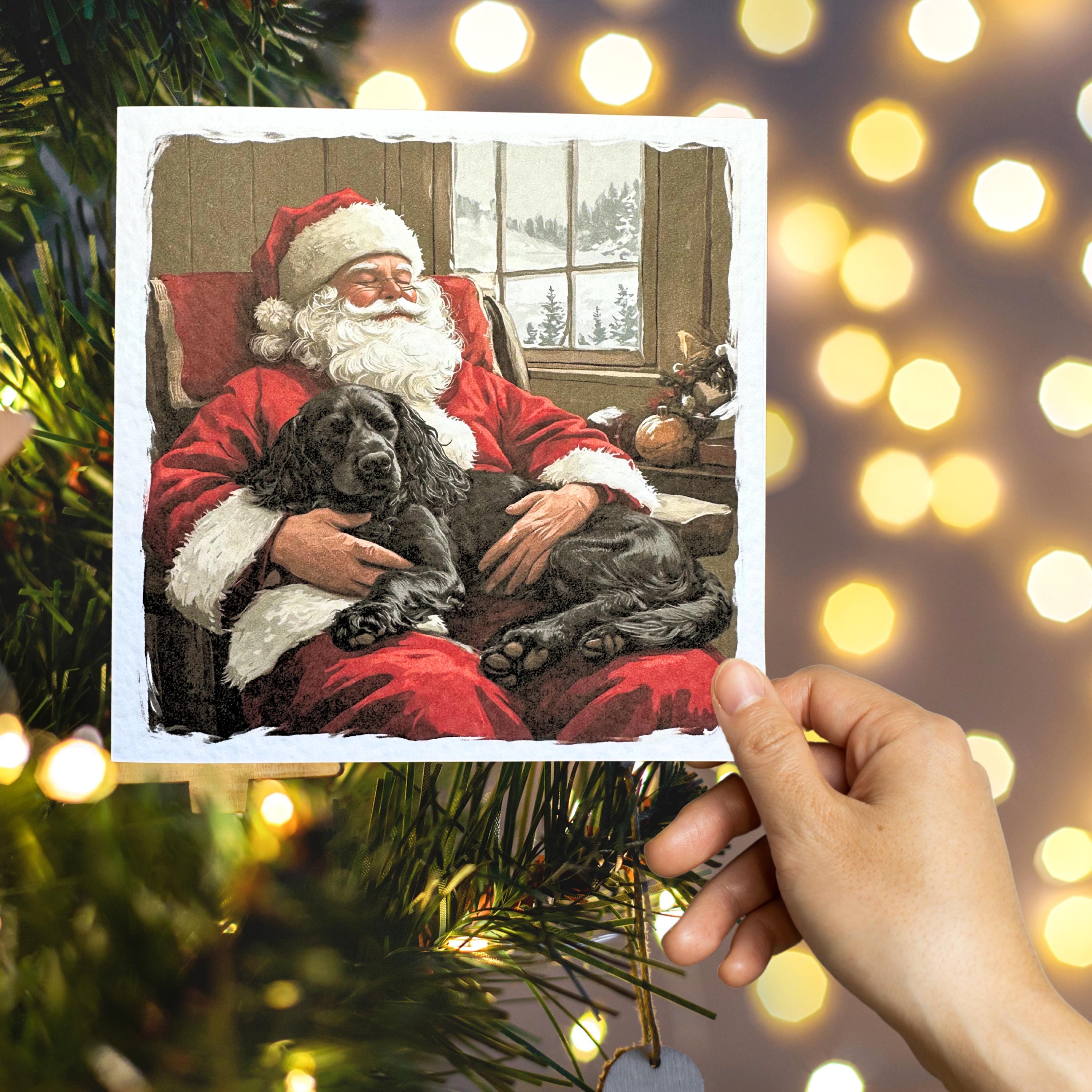 Looking for the perfect birthday card for a dog or black cocker spaniel lover? This charming 6x6 inch card features an illustration of a beautiful black cocker spaniel dog asleep on santas lap.