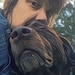 An illustration of a cute black labrador dog cuddling a santa toy.
