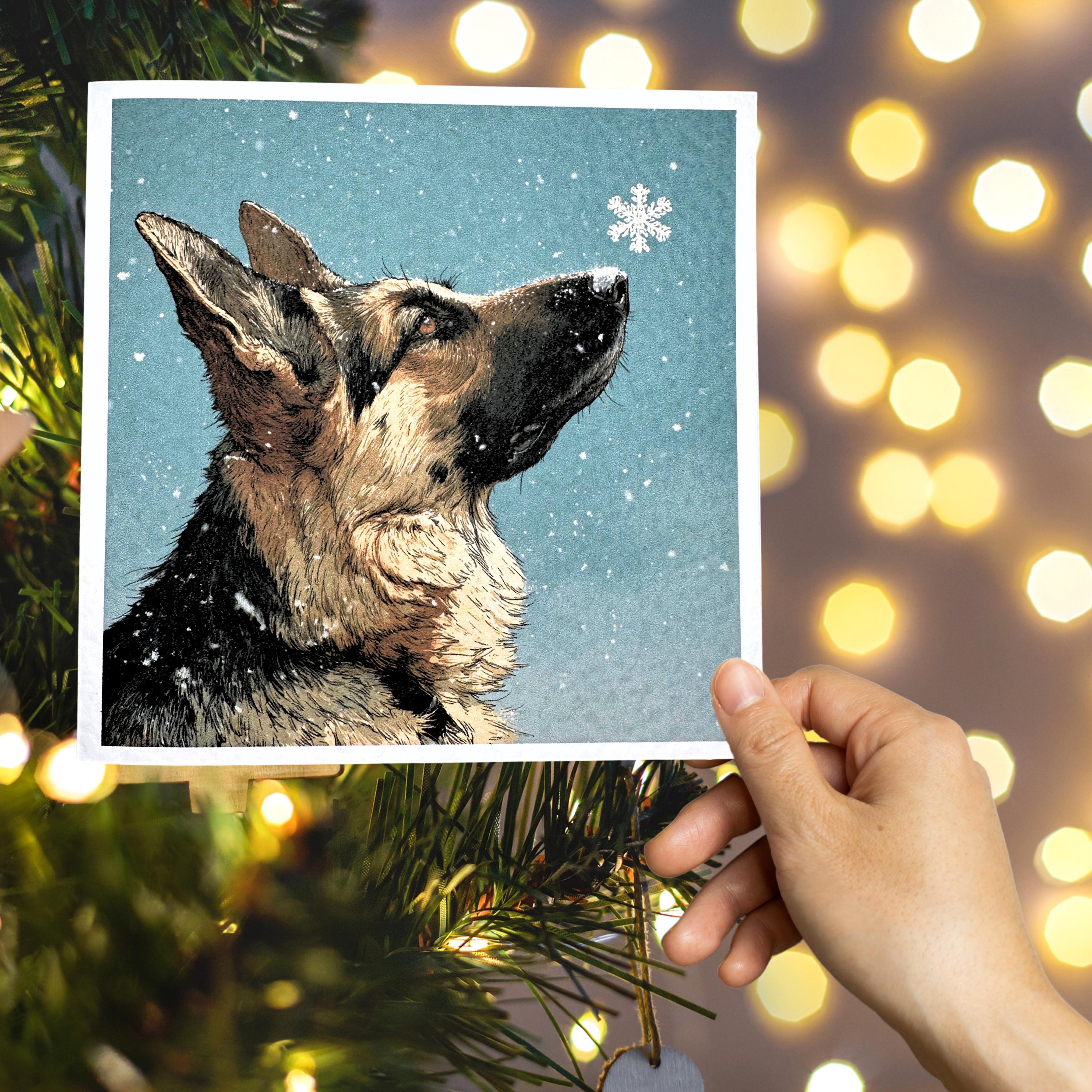 This charming Christmas card features an illustration of a German Shepherd catching snowflakes on its nose. The dog's expressive eyes and gentle gaze are sure to bring a smile to the faces of your loved ones.