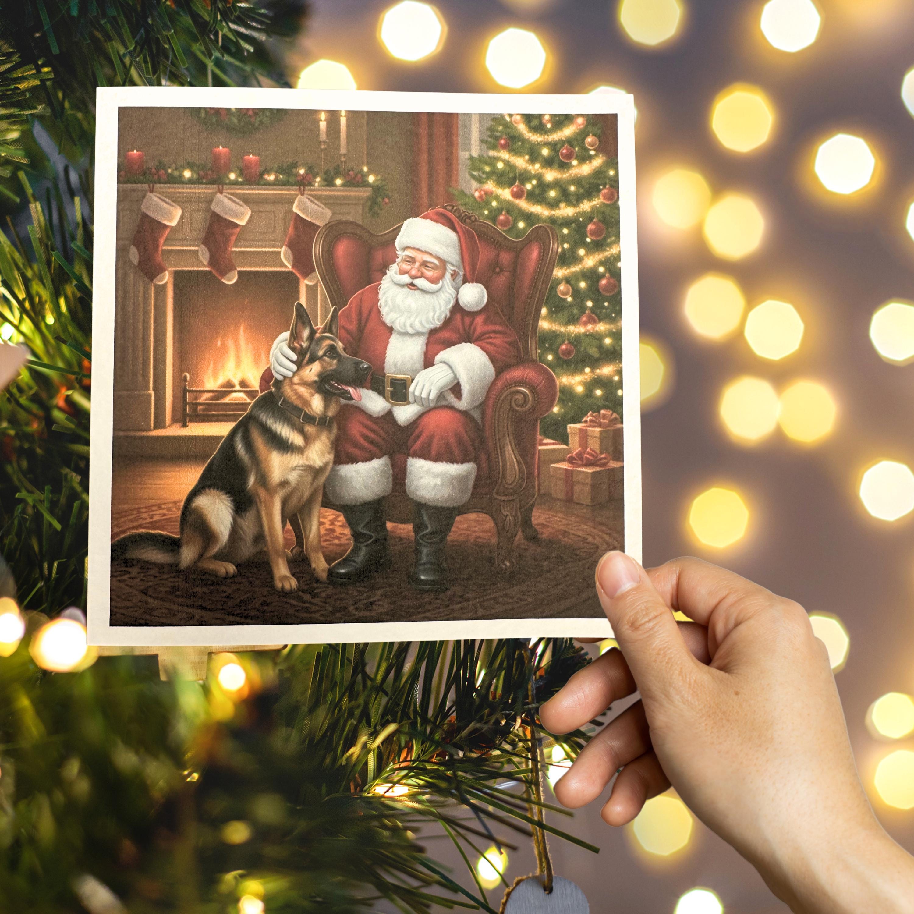 This charming Christmas card features an illustration of a German Shepherd sitting with santa.
