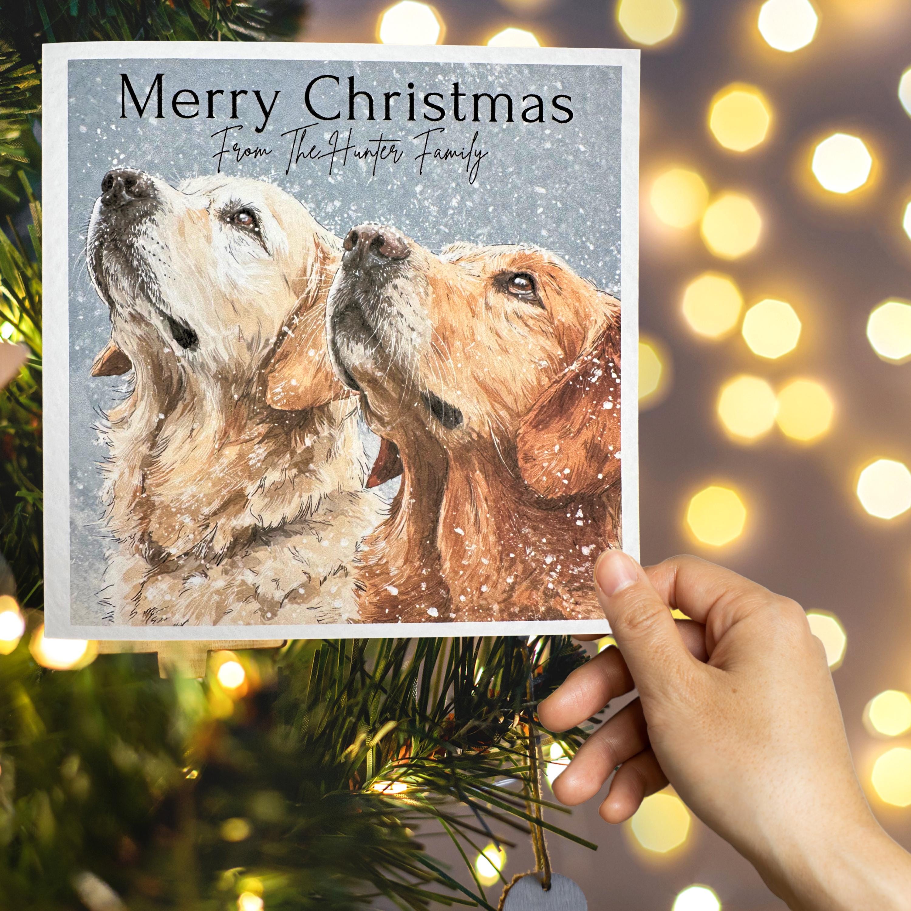 This charming Christmas card features a heart warming image of two Golden Retrievers looking up at the snow. The dog's expressive eyes and gentle gaze are sure to bring a smile to the faces of your loved ones.