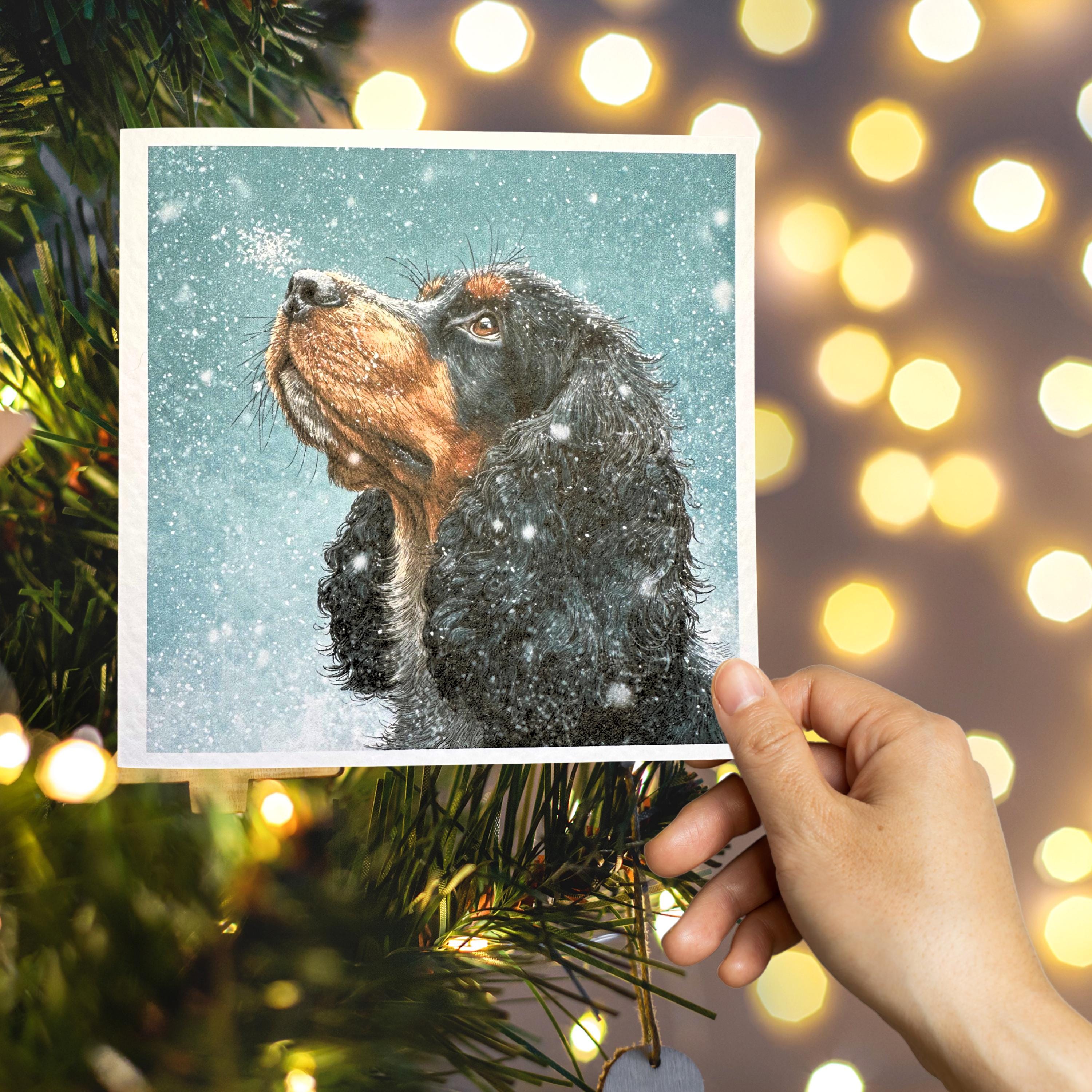 Looking for the perfect Christmas card for a dog or Black and tan Cocker Spaniel lover? This charming 6x6 inch card features an illustration of a beautiful Black and tan Cocker Spaniel dog.