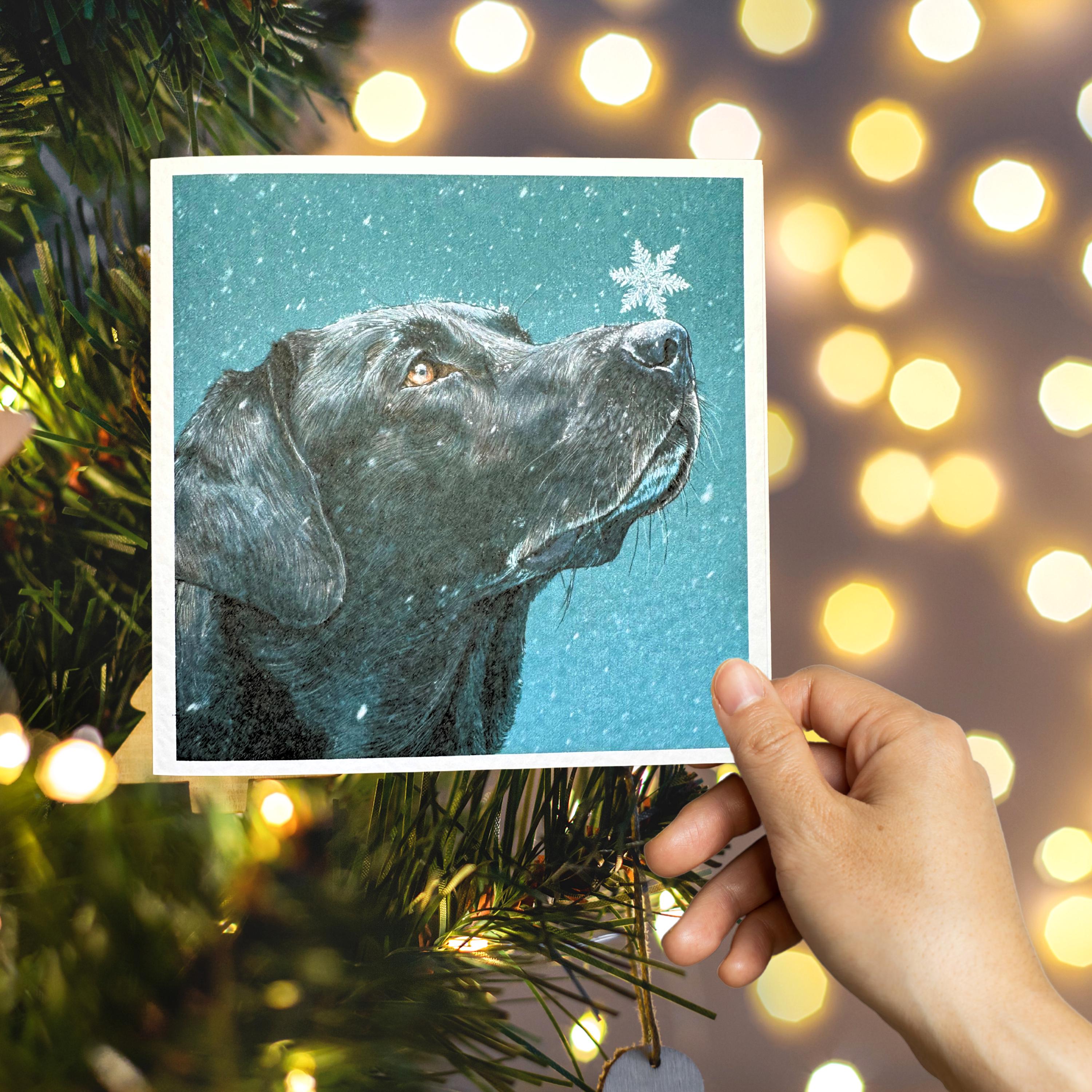 This charming Christmas card features an illustration of a black Labrador catching snowflakes on its nose. The dog's expressive eyes and gentle gaze are sure to bring a smile to the faces of your loved ones.