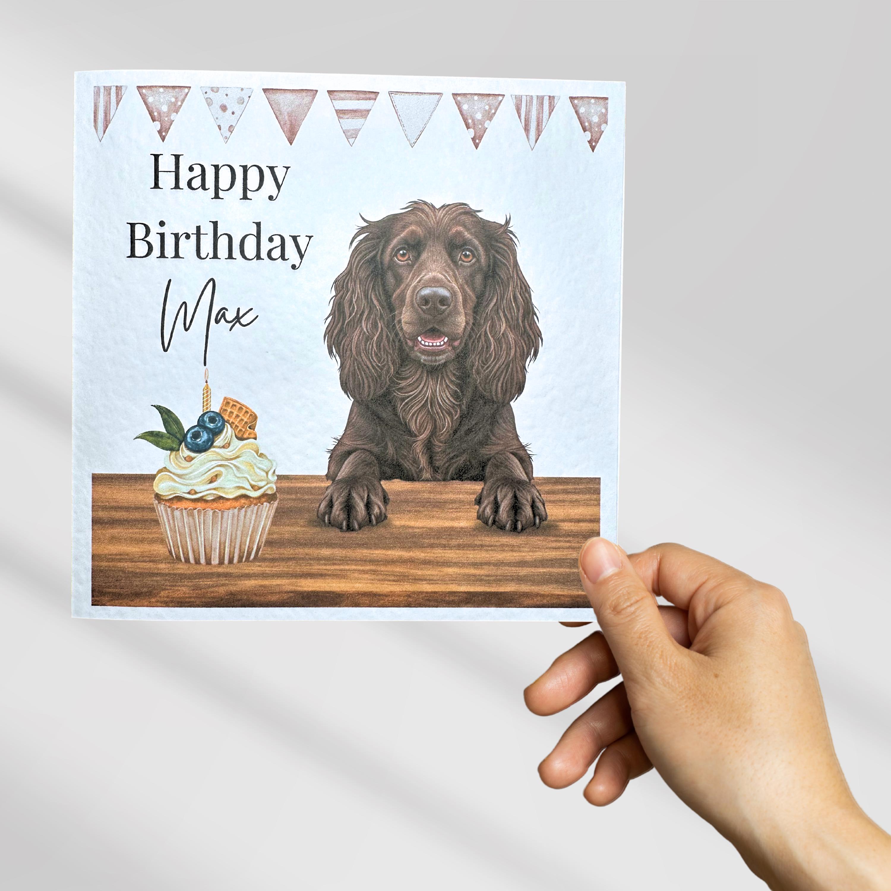 Looking for the perfect birthday card for a dog or cocker spaniel lover? This charming 6x6 inch card features a beautiful chocolate brown working cocker spaniel dog with a cake!
