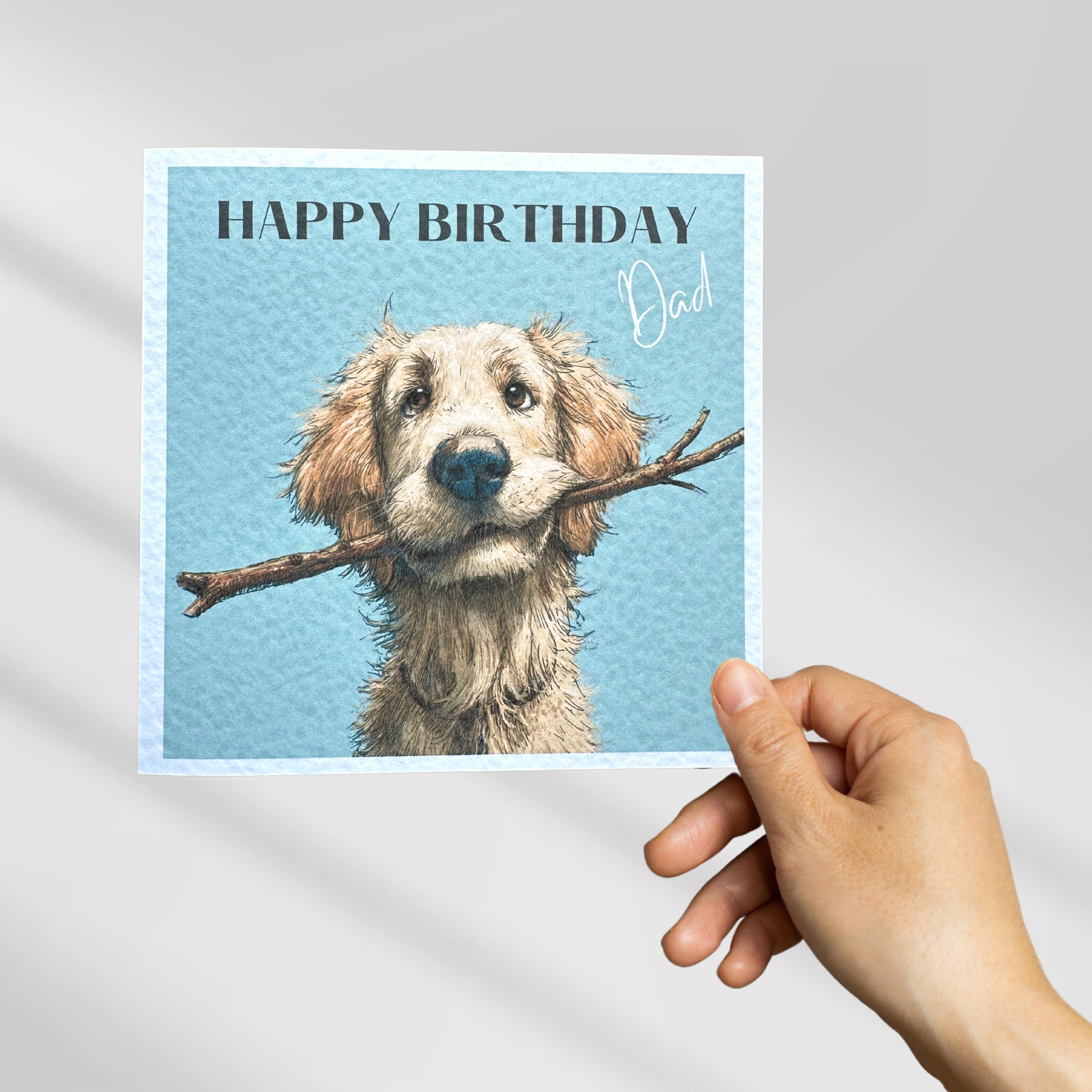 Looking for the perfect birthday card for a dog or golden retriever lover? This charming 6x6 inch card features a cheeky golden retriever dog with a stick.