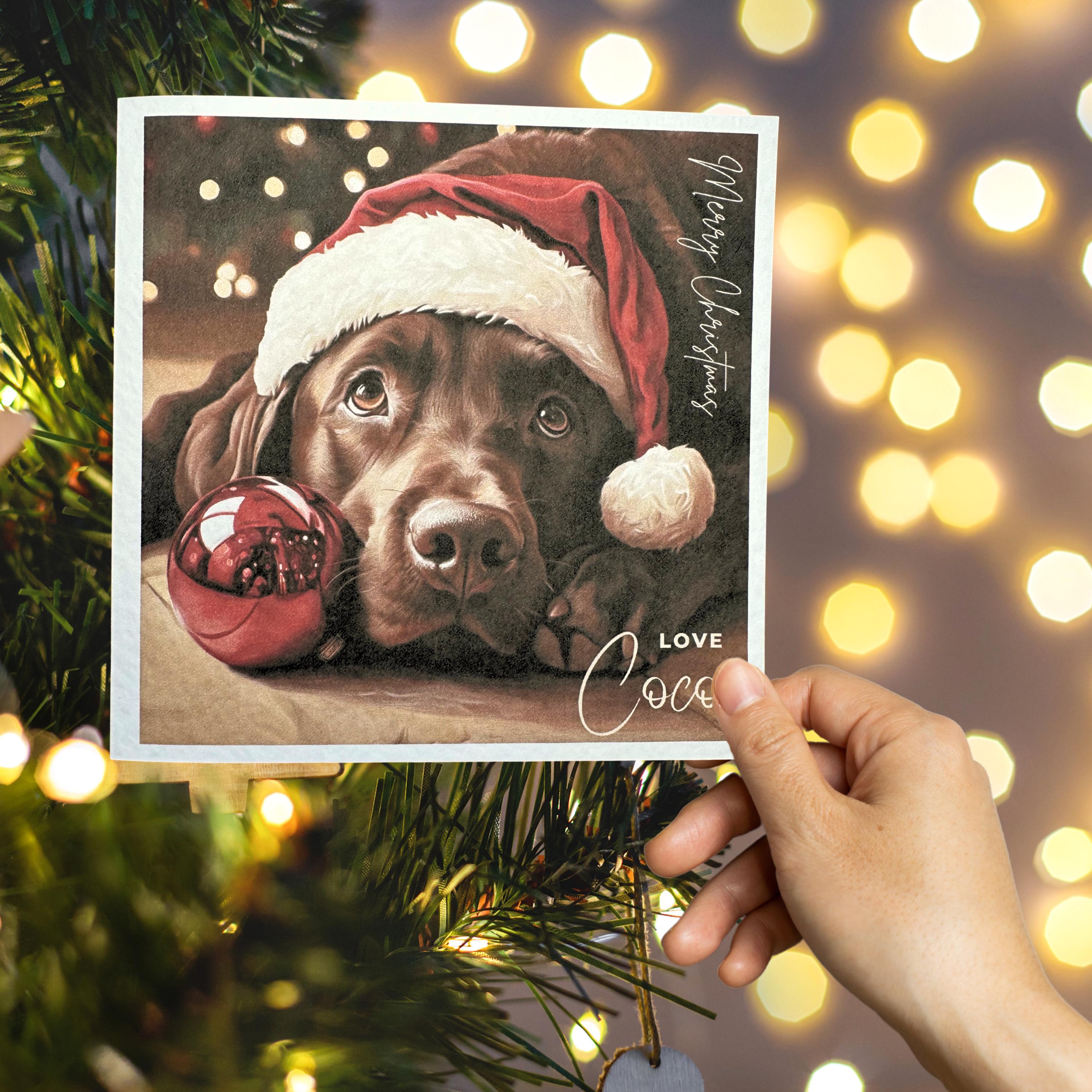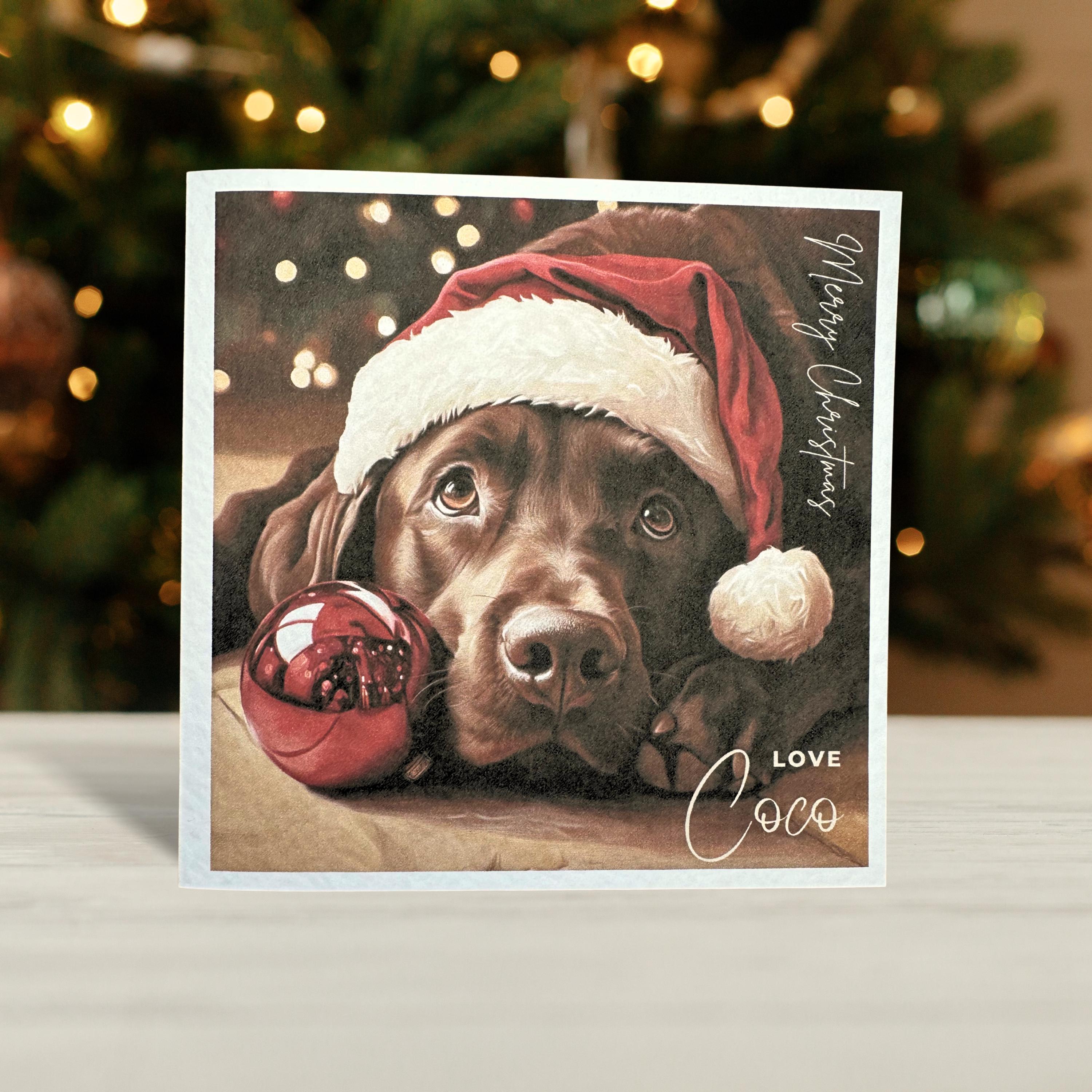 This charming Christmas card features an illustration of a Chocolate Brown Labrador with a santa hat and a bauble.