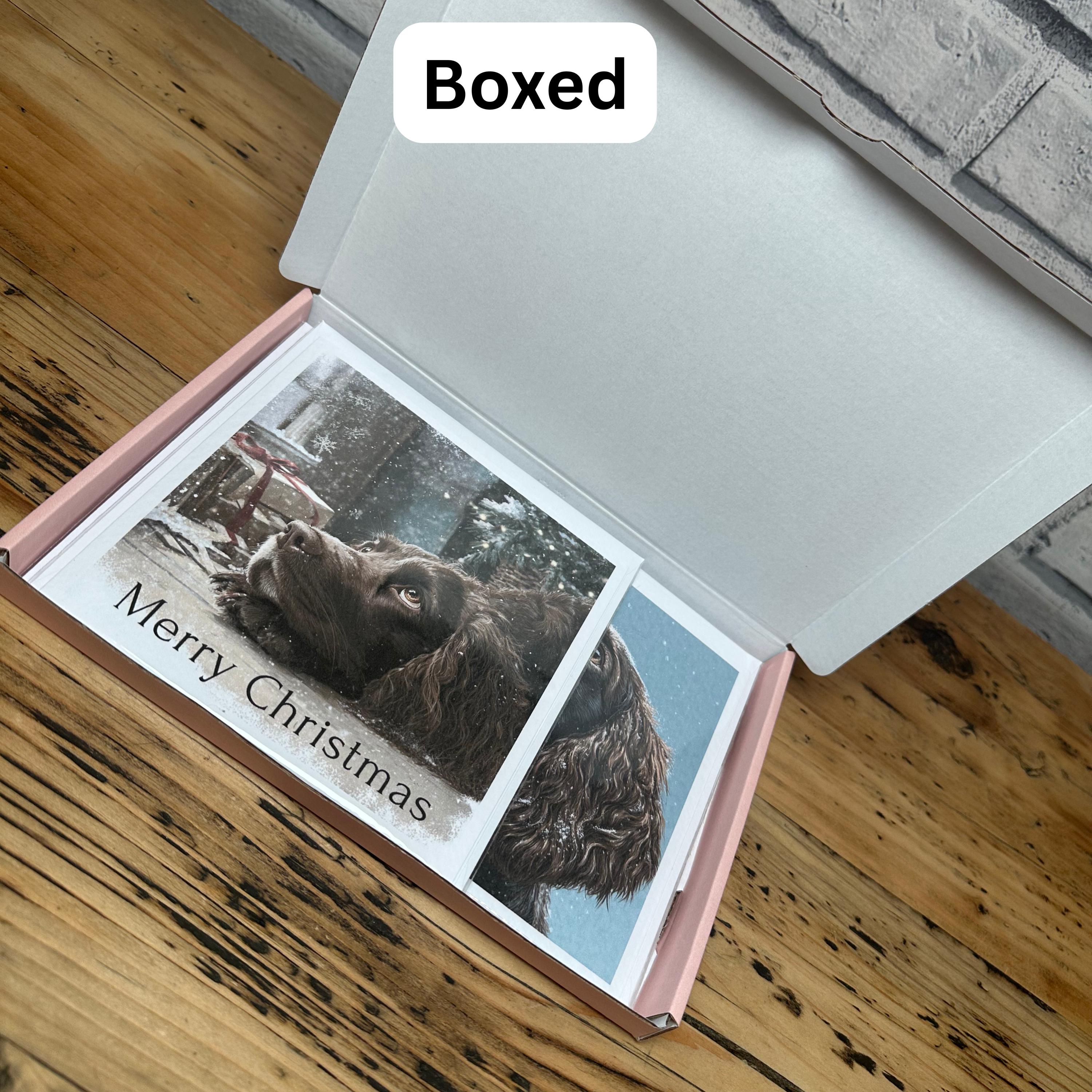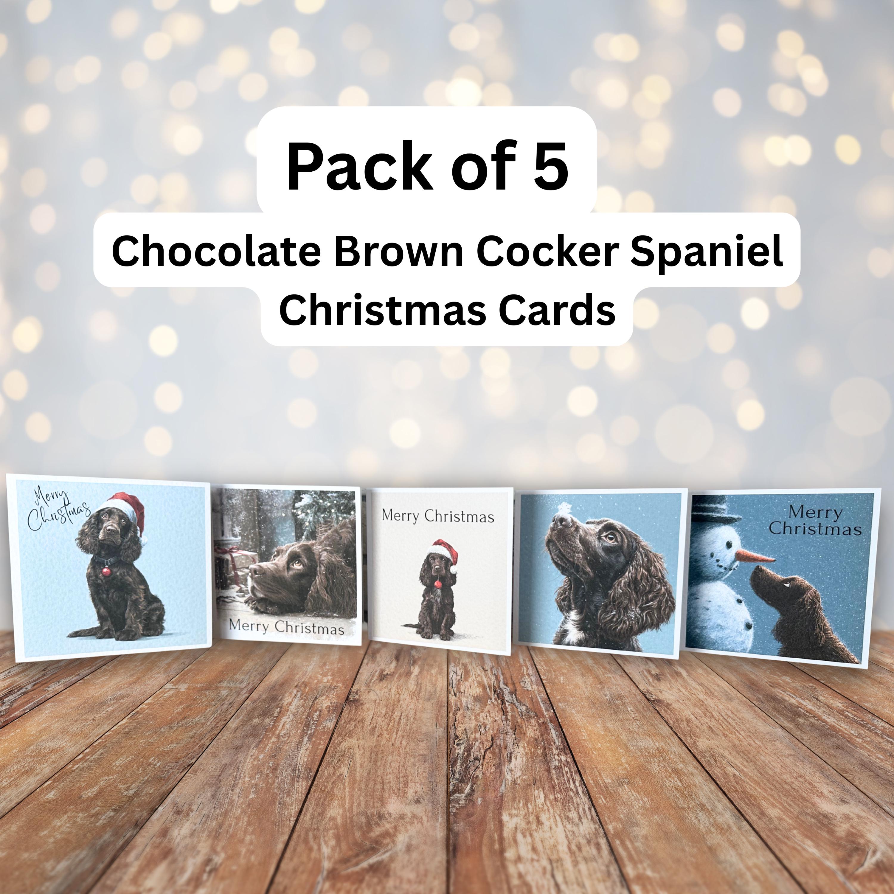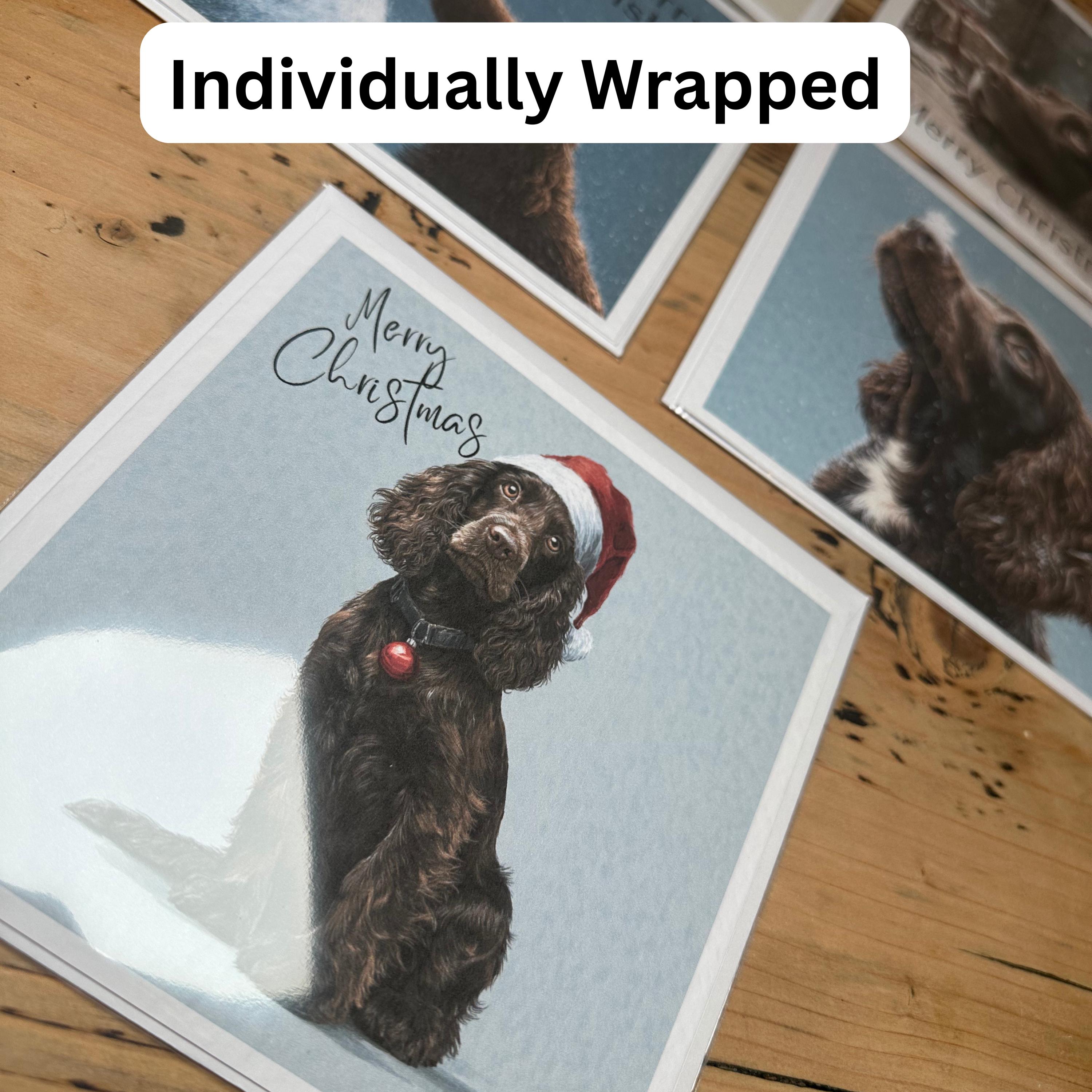 Pack of 5 individually wrapped brown cocker spaniel christmas cards.
