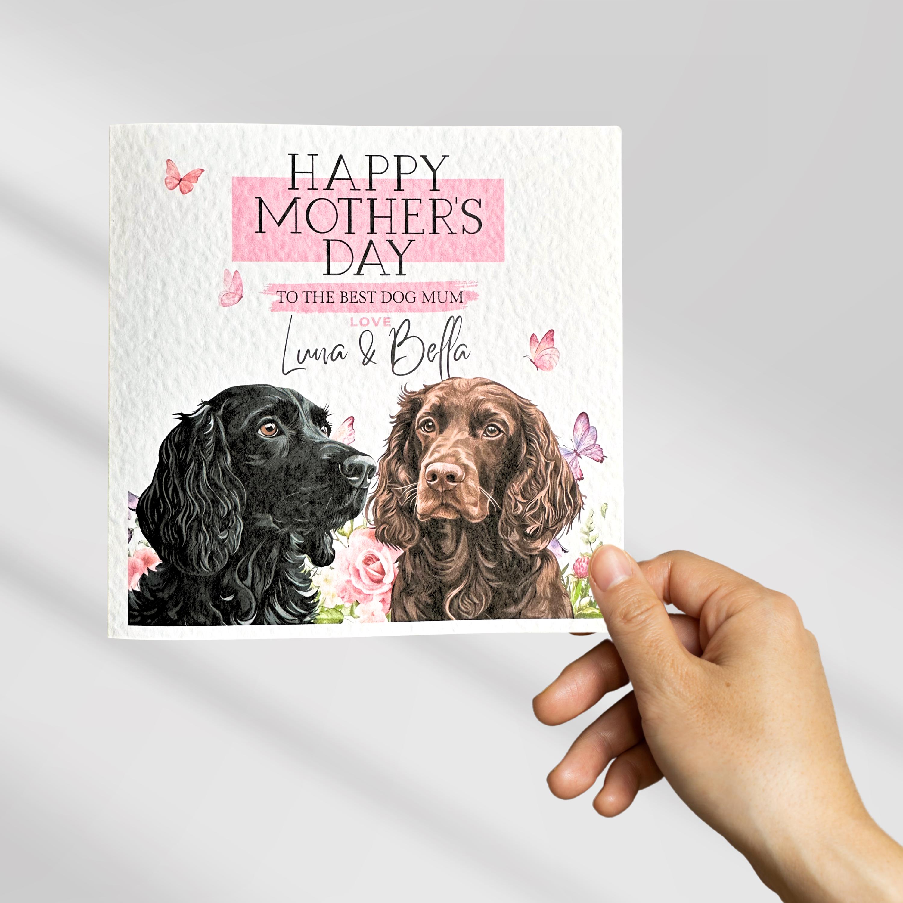 Looking for the perfect mothers day card for a dog or cocker spaniel lover? This charming 6x6 inch card features a beautiful black and brown working cocker spaniel dogs.