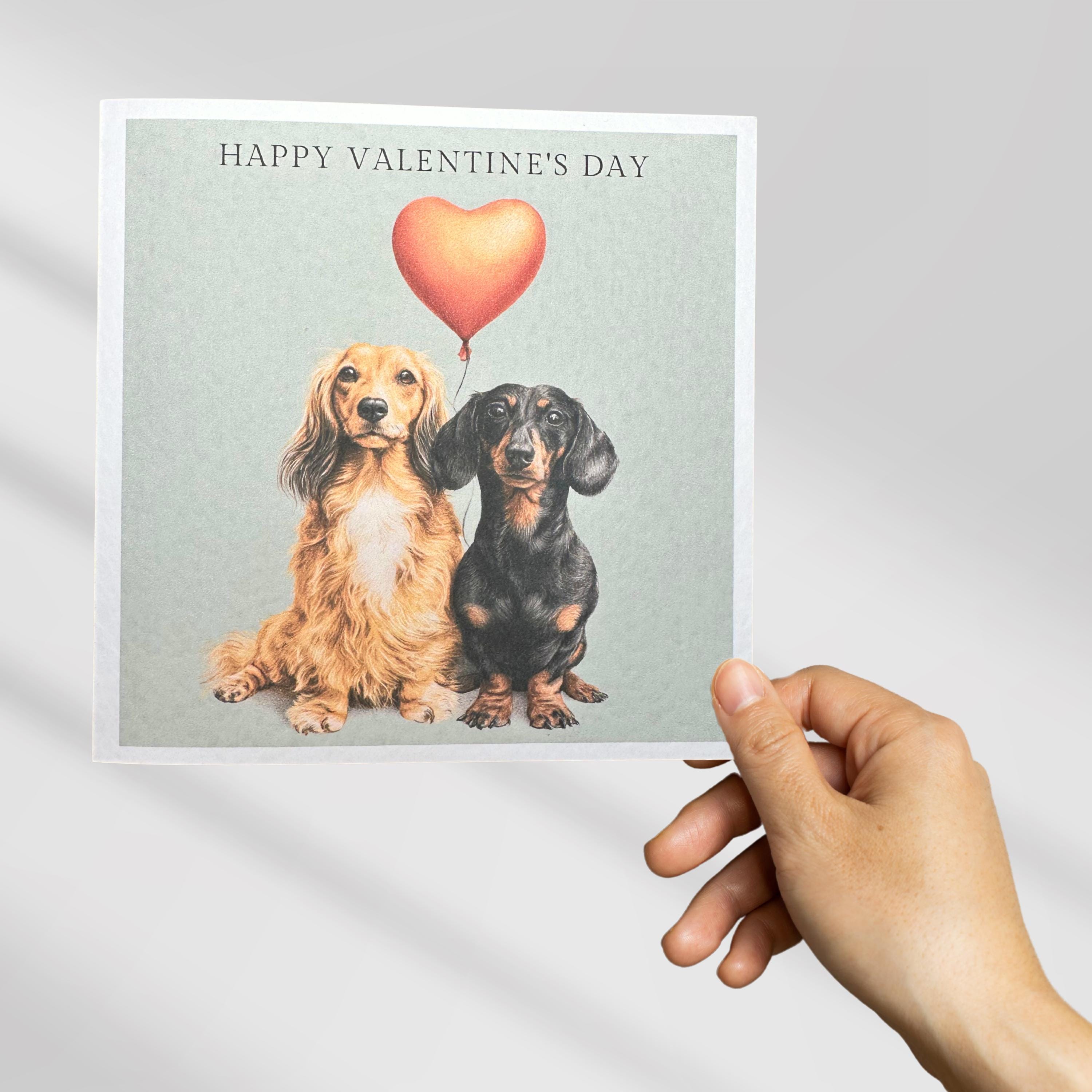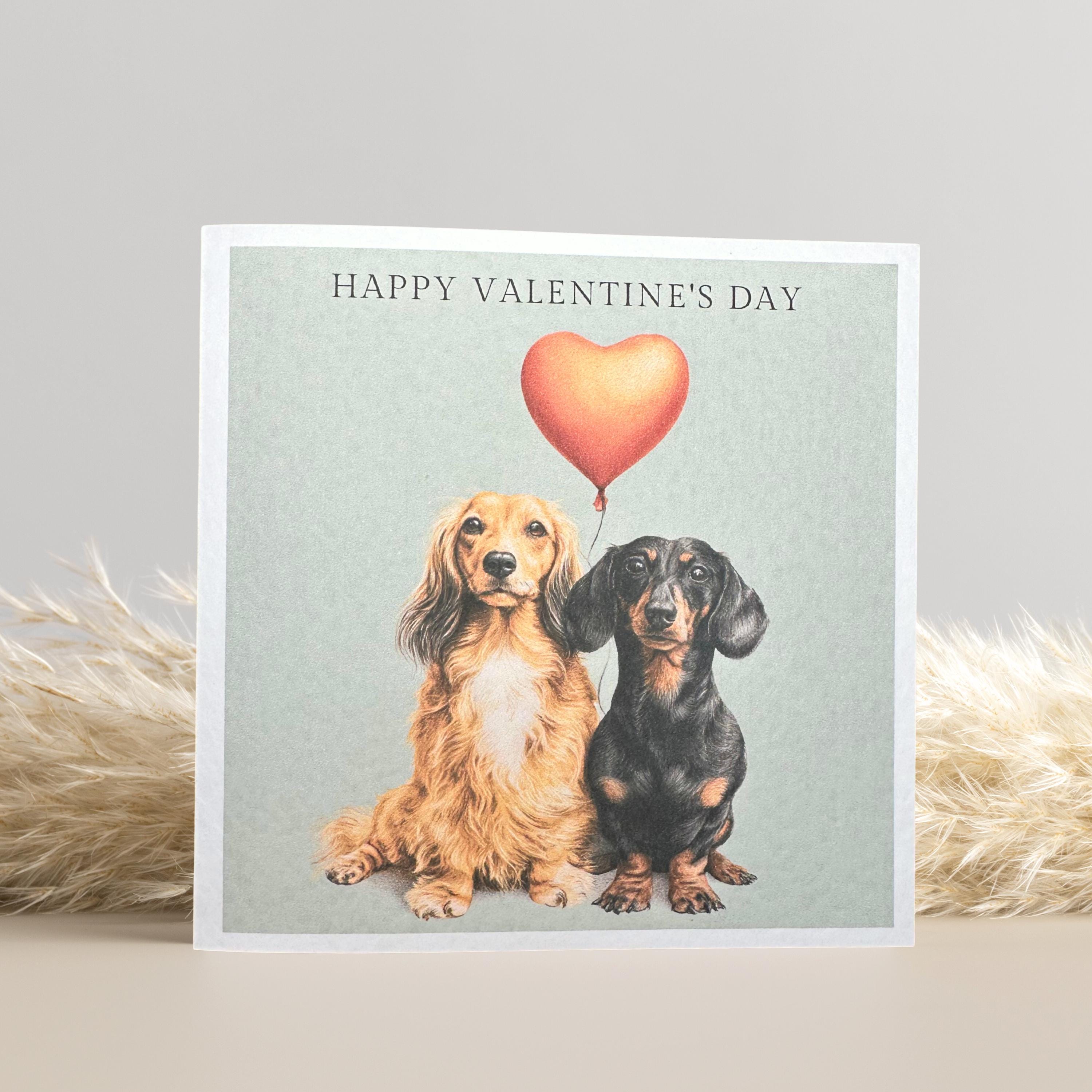 Looking for the perfect valentines card for a dog or Dachshund lover? This charming 6x6 inch card features two beautiful Dachshund dogs. A golden daxie and a black and tan daxie.