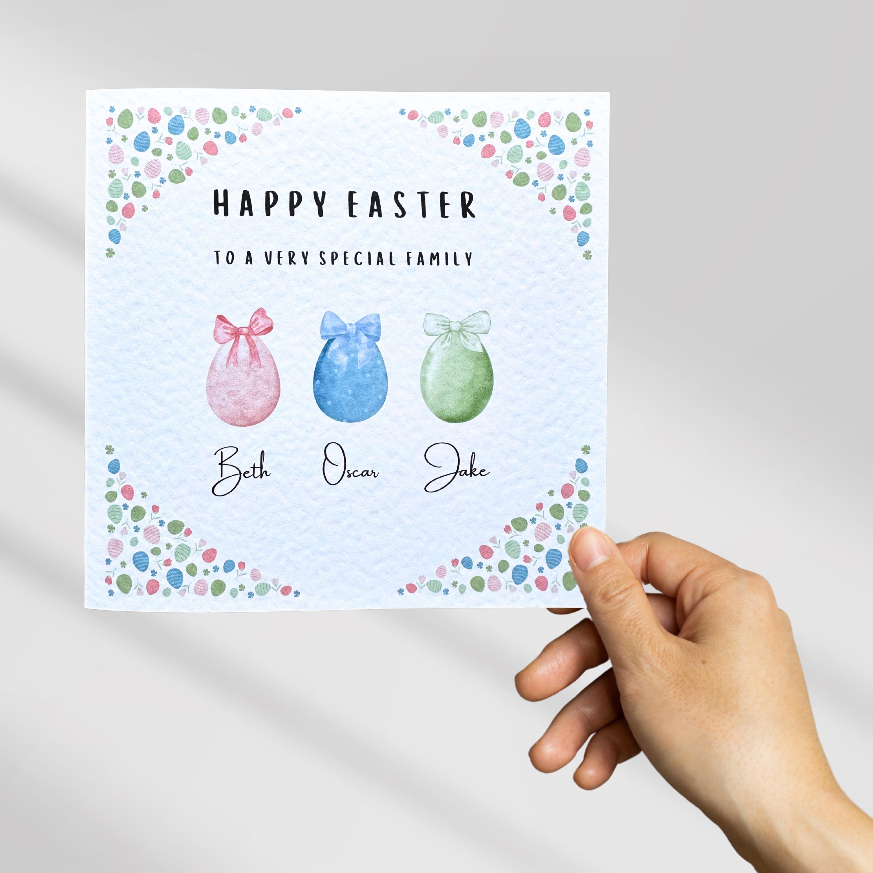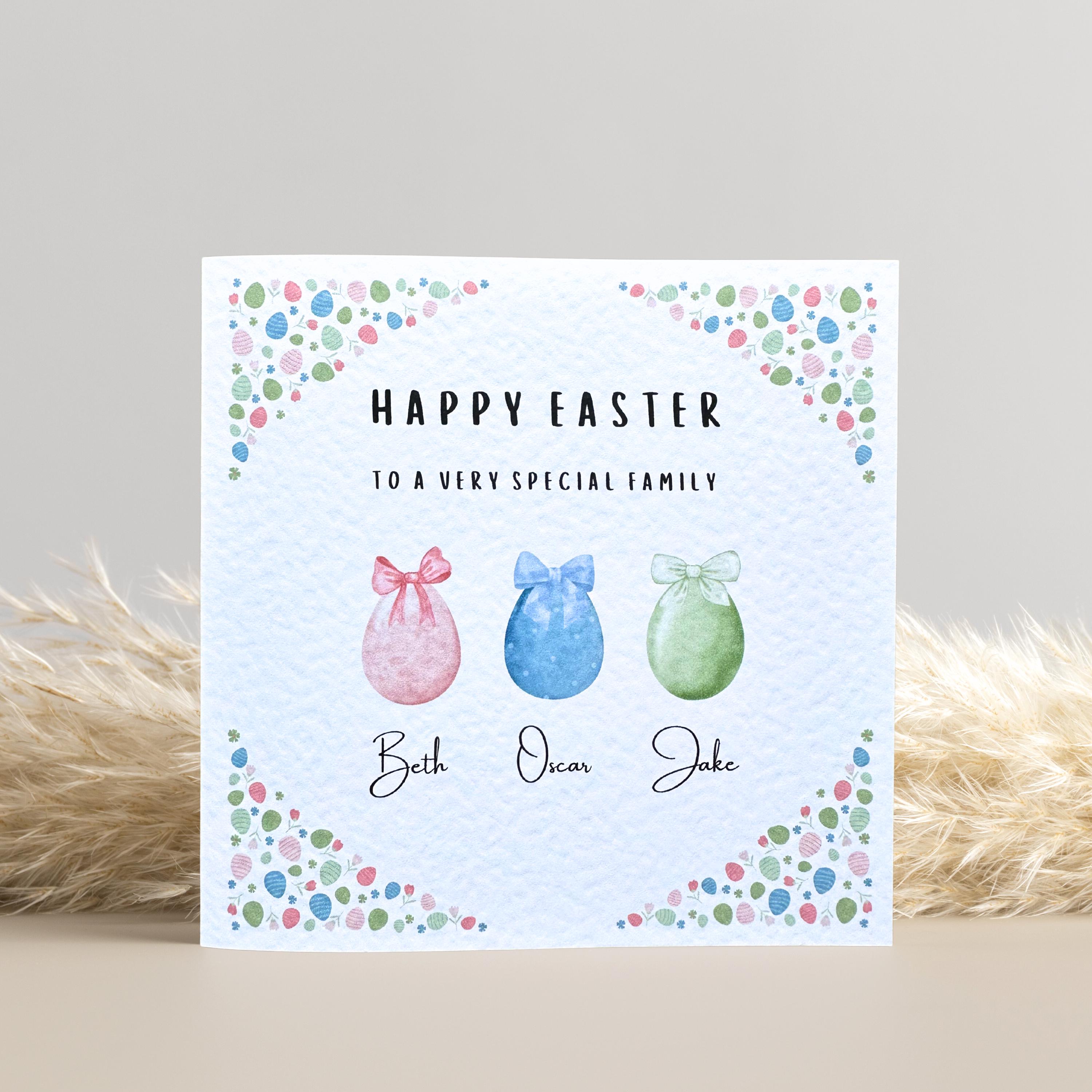 This adorable 6x6 inch greeting card features an illustration of soft pastel coloured easter eggs each with a family name underneath.