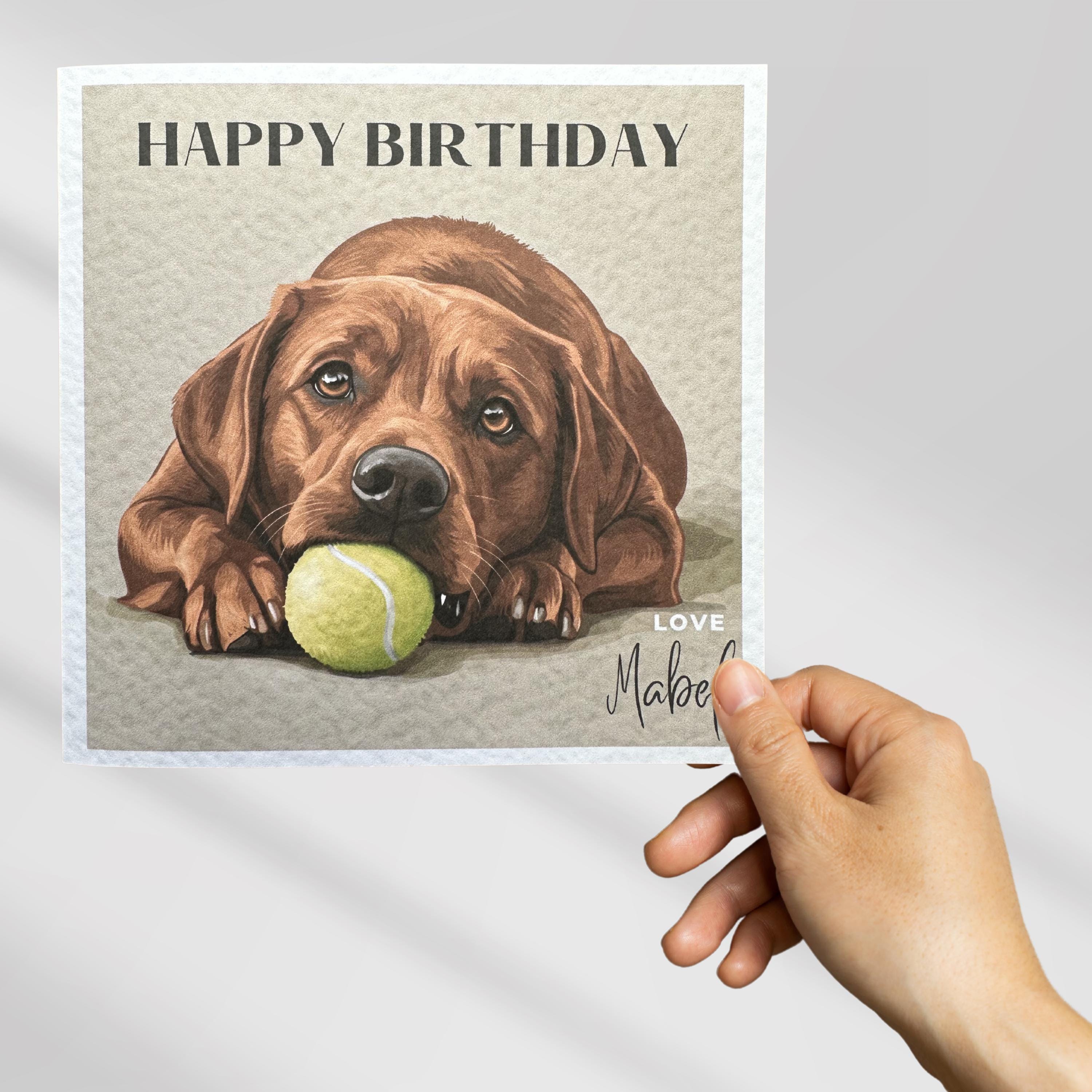 Looking for the perfect birthday card for a dog or labrador lover? This charming 6x6 inch card features a beautiful Fox Red labrador dog holding a tennis ball.